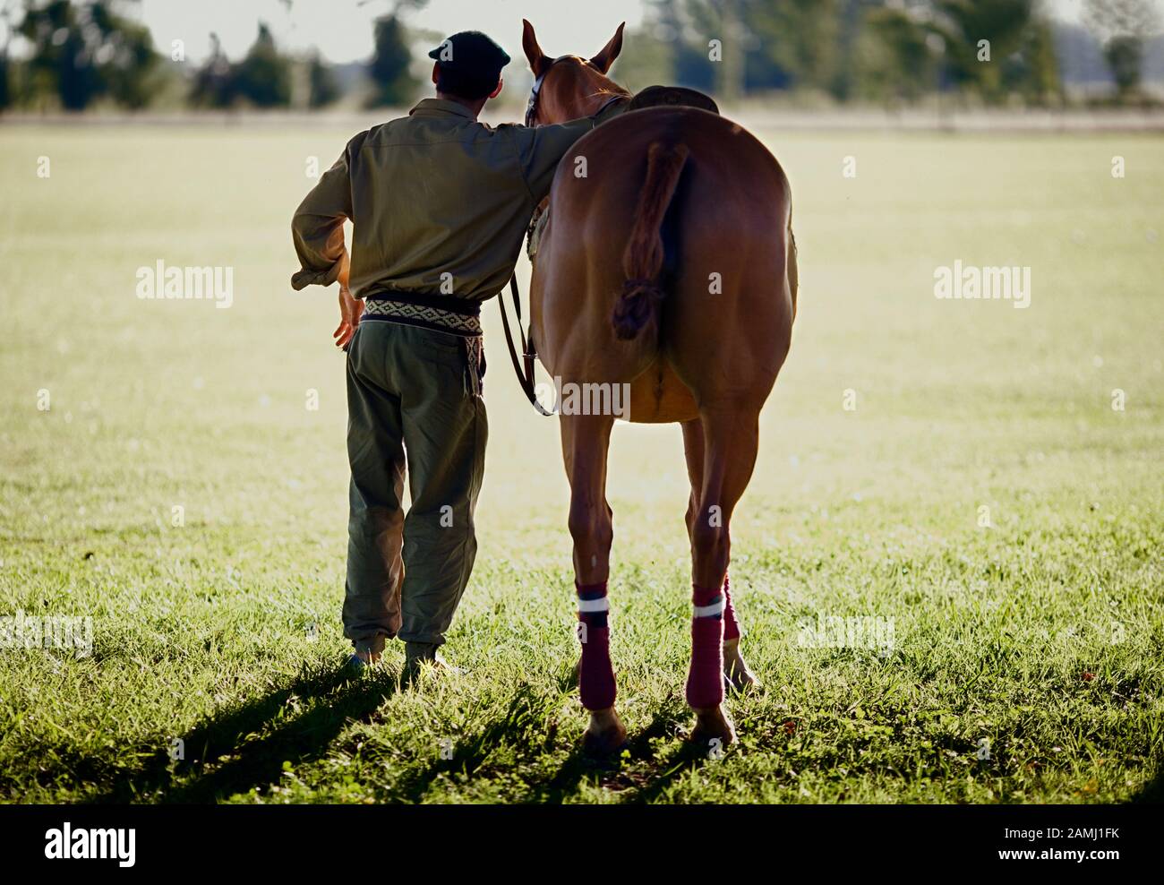 Rear View Of A Man Standing With A Horse Stock Photo Alamy